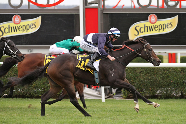 At Morphettville in Adelaide, Arrowfield Stud's multiple Champion Australian Sire Redoute's Choice (Danehill-Shantha's Choice, by Canny Lad) celebrated an elite success when high class 3YO filly Abbey Marie (Redoute's Choice (AUS) 1996 out of Catshaan (AUS) 1999, by Catrail) scored by 0.4-length for trainer Mick Kent in the $400,000 Gr1 Australasian Oaks (2000m) for 3YO fillies, over fellow 3YO fillies Silent Sedition (War Chant-Fiorentina, by Dubai Destination) & C'Est Beau la Vie (Bernardini-Valkyrie Diva, by Jade Robbery). The beautifully bred Abbey Marie, who marked herself as one of the most exciting horses in the country in claiming her first Gr1 victory at just her third career start, extended her unbeaten record to 3 wins from 3 starts for $315,870 earnings. The daughter of Redoute's Choice and Catshaan emulated the classic success of her full-sister Absolutely whom Kent trained to win the Gr1 Australian Oaks (2400m) at Royal Randwick in 2011. "I was really happy with her and the trip didn't worry me, but she's just having her third start - it was really hard to line her form up," Kent told Racing.com. "She's just a beautiful, relaxed filly and she's coped with the prep. She walked around the mounting yard here like an old timer." Kent said Abbey Marie would be sent for a spell and be set for the Gr1 Myer Classic in the spring. Bred by Arrowfield Stud, Abbey Marie was a $300,000 purchase by Dermot Farrington Bloodstock at the 2014 Inglis Australian Easter Yearling Sale. She and Absolutely descend from a prolific Gr1-producing family that includes Indian Rose, Kinshasa No Kiseki, Plumania and successful sire Groom Dancer.