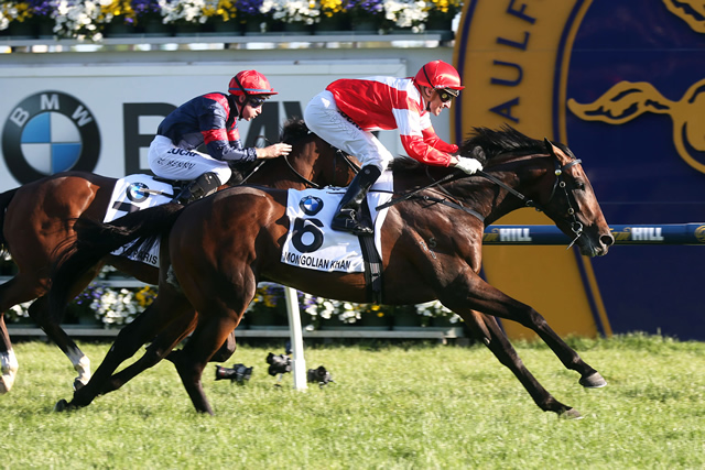 At Caulfield in Melbourne, dual Gr1-winning former Coolmore shuttler Holy Roman Emperor (Danehill-L'On Vite, by Secretariat) celebrated a Gr1 success when 4YO entire Mongolian Khan (Holy Roman Emperor-Centafit, by Centaine) scored by 0.5-length for trainers Murray Baker & Andrew Forsman in the $3 million Gr1 Caulfield Cup (2400m) for 3YO+, over 5YO Irish-bred gelding Trip To Paris (Champs Elysees-La Grande Zoa, by Fantastic Light) & 6YO German-bred entire Our Ivanhowe (Soldier Hollow-Indigo Girl, by Sternkönig). Mongolian Khan was originally a $9,000 purchase at the 2012 Inglis Great Southern Weanling Sale from the Grenville Stud draft, before subsequently making $140,000 at the 2013 NZB Select Yearling Sale from the draft of Ainsley Downs Stud, before finally being re-sold to the Mongolian Rider Horse Group for $220,000 at the 2013 NZB Ready To Run Sale from the draft of Regal Farm. His Caulfield Cup victory boosted his record to 8 wins (including the Gr1 Australian Derby, Gr1 New Zealand Derby, Gr2 Avondale Guineas, Gr2 Waikato Guineas & Listed Champion Stakes Prelude) and 1 placing (the Gr1 Caulfield Stakes) from 13 starts for $3,870,333 earnings. Co-trainer Murray Baker, who was celebrating his first Caulfield Cup victory, said: "You're never confident coming into a race like this, but he was as well as we could have him. We thought if we could get to the front, nothing would get past him." He added: "It's one I've always wanted to win - it's the strongest 2400m handicap in Australasia - a great race." Baker said he expects Mongolian Khan to be even better suited in the Melbourne Cup, for which he is now $7 third favourite with TAB. "We think he's probably more of a Melbourne Cup horse, but it's whether they can run that extra 800m," he said. "I think he can get it."